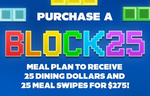 Need a few extra meals to finish the semester strong? The Block 25 Plan is here to help! It’s perfect for students running low on swipes or those who want to test out a meal plan before the Spring. This plan includes 25 meal swipes & 25 Dining Dollars, the perfect combo to keep you fueled through finals!