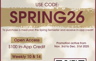 Need a Meal Plan for the Spring? We’ve got you covered! Sign up for a Spring Meal Plan and use our promo code SPRING26 to receive in-app credit! This in-app credit will be loaded into the Transact Mobile Ordering app for you to enjoy in the Spring! Start the semester strong with great food, less stress, and Mobile Ordering credit! Already have a Fall Meal Plan? No need to sign up for a Spring plan too, your Meal Plan includes both the Fall & Spring semesters!