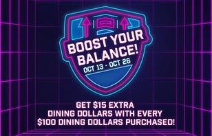 Running low on Dining Dollars? From October 13th to October 26th, we are running a special deal to Boost your Dining Dollar balance! For every $100 Dining Dollars purchased, you’ll get $15 bonus Dining Dollars!