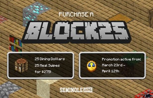 Need extra meal swipes to finish the Spring semester or want to test-drive a plan before Fall? The Block 25 Meal Plan gives you 25 meal swipes and $25 dining dollars for $275. Limit two Block 25 plans per order. Available for purchase March 23rd - April 12th