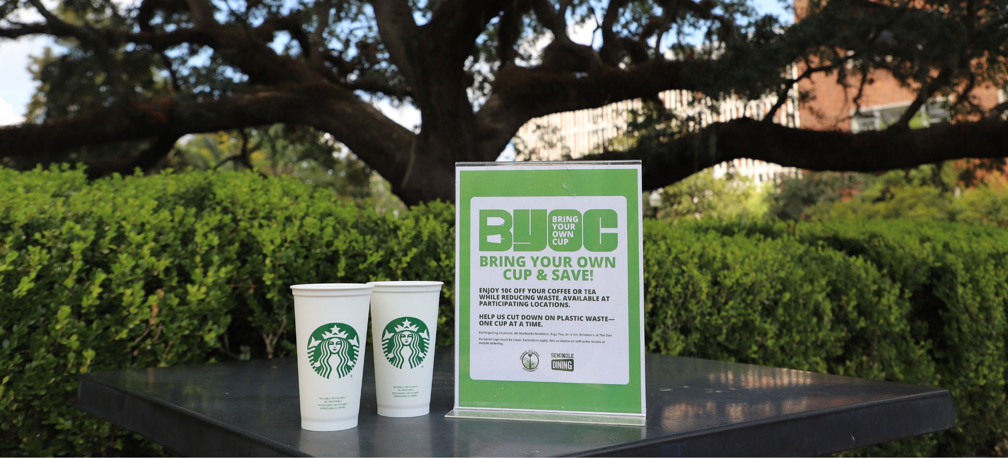 Seminole Dining encourages sustainability through our Bring Your Own Cup (BYOC) program, making it easy for guests to reduce single-use waste while enjoying their favorite beverages.